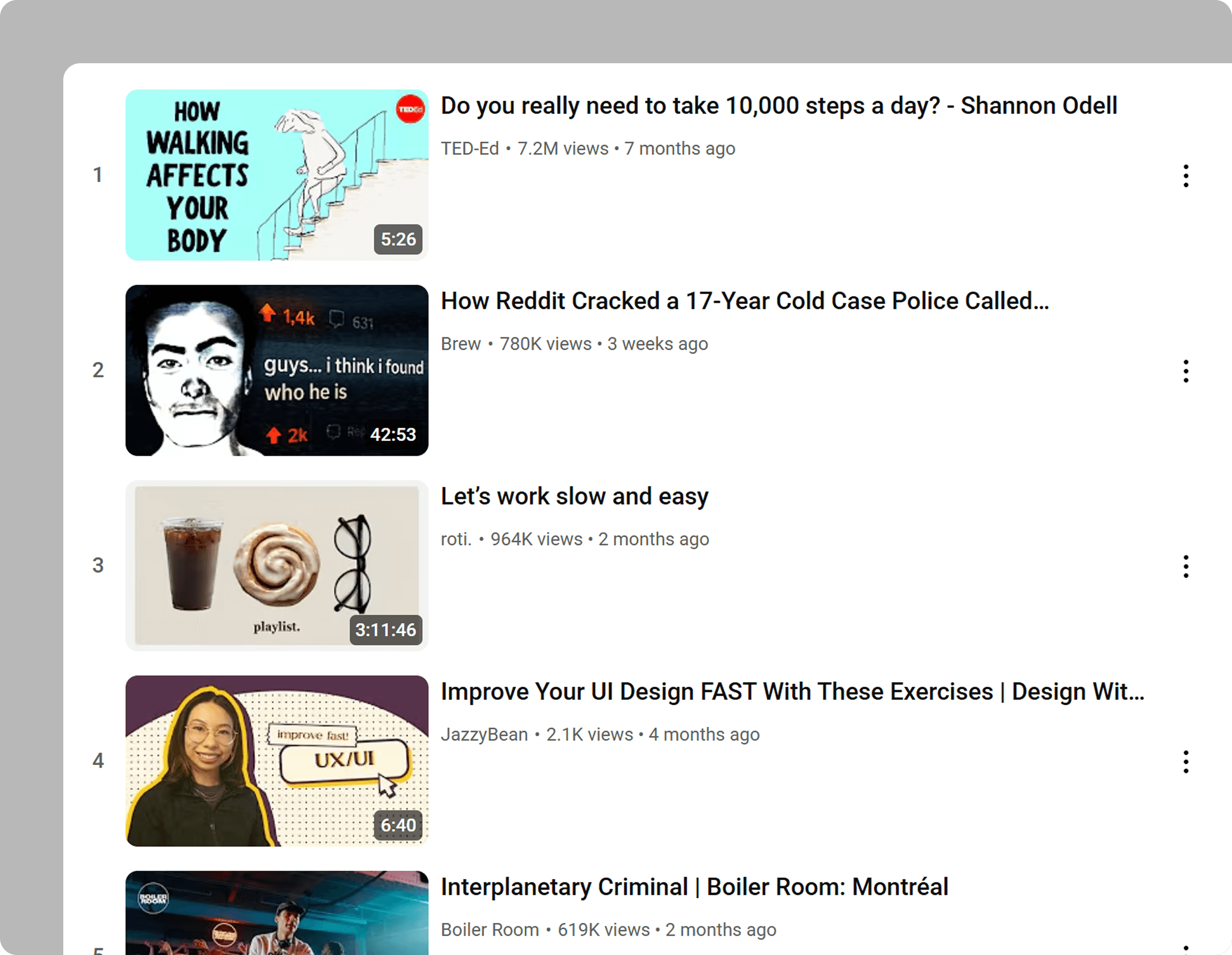 One long column forces users to hunt video-by-video, making quick discovery nearly impossible.