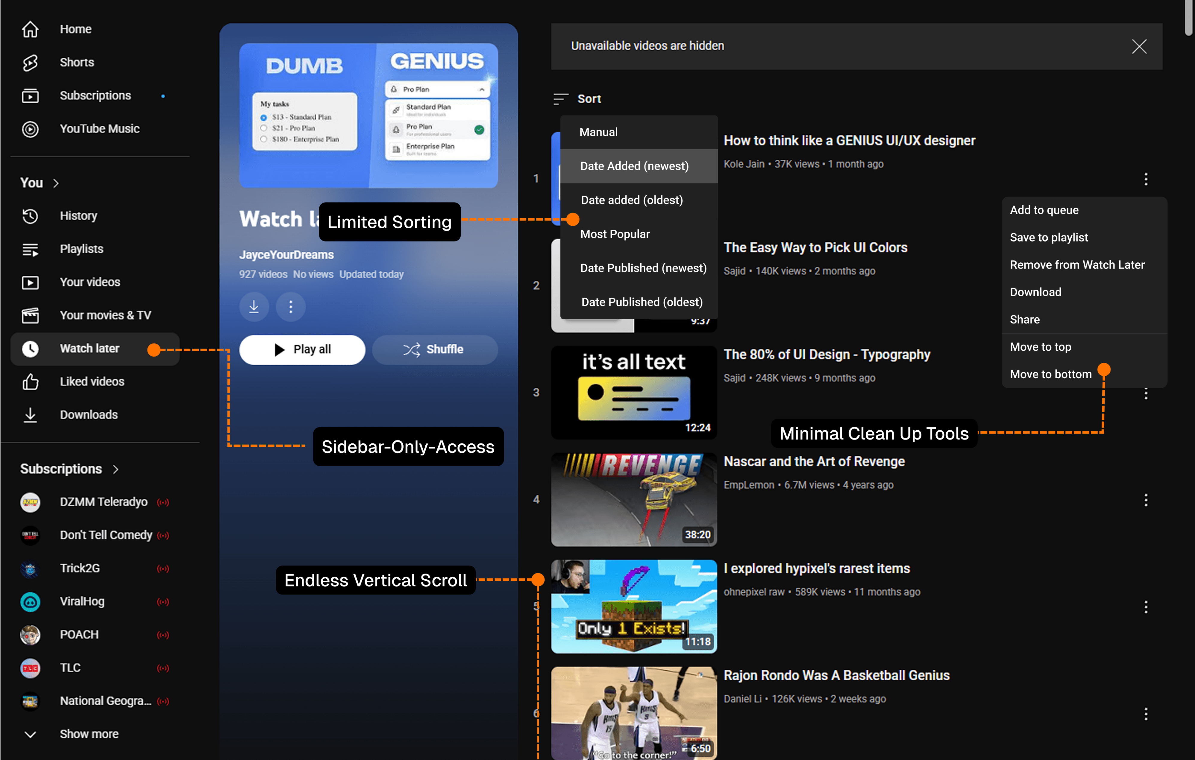 Let’s take a closer look at the problems that the user’s face that weakens Watch-Later’s usefulness and convenience—and see them play out on the screen.